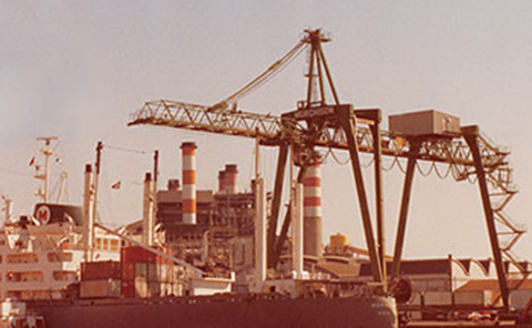 Murchison instala la primera grúa pórtico de Sudamérica, en la dársena C del Puerto Nuevo de Buenos Aires.